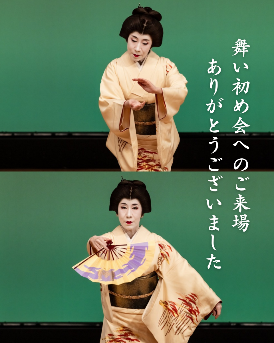 「舞い初め会」とは、新しい年の始まりに、芸の上達を願いつつ一年の抱負を演目に乗せて披露する会です。