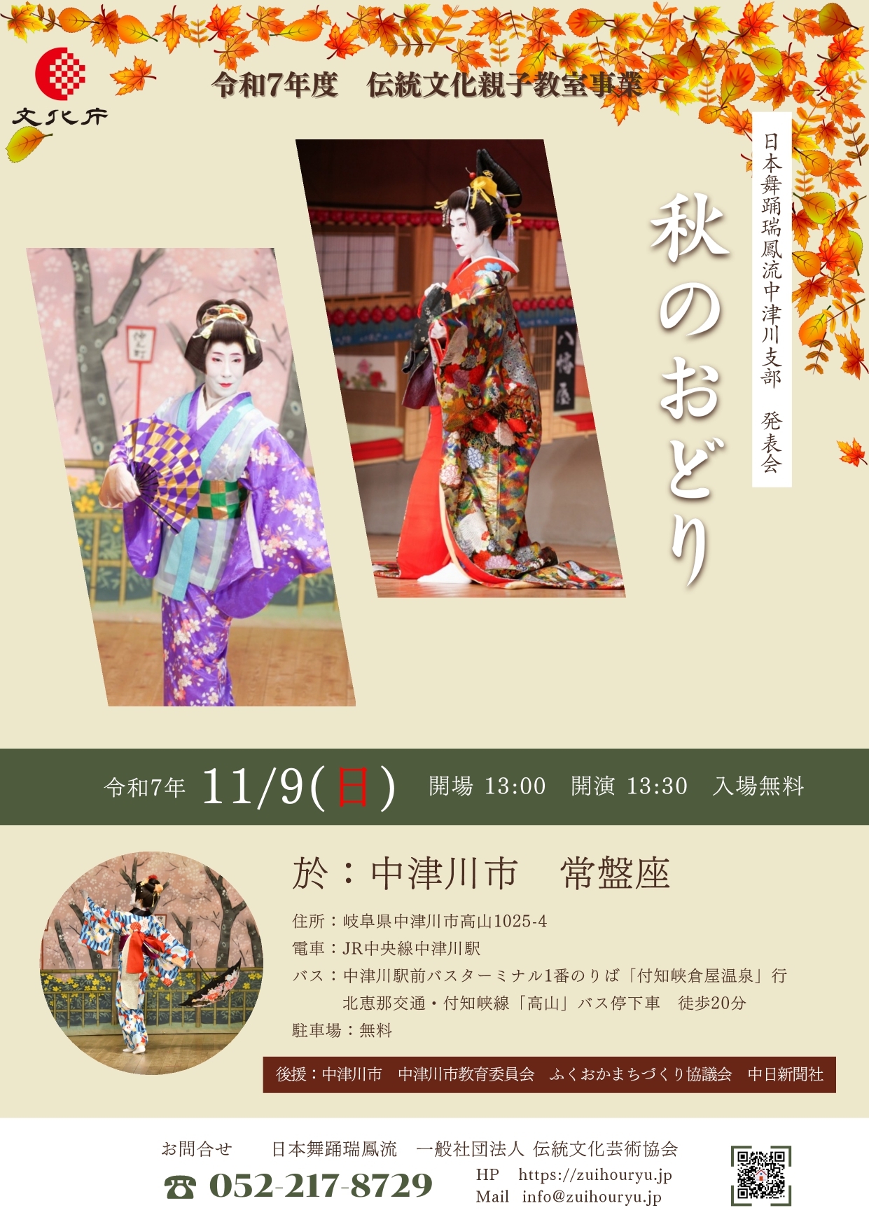 2025年11月9日(日)、中津川市の常盤座にて中津川支部発表会「秋のおどり」を開催いたします。 ...